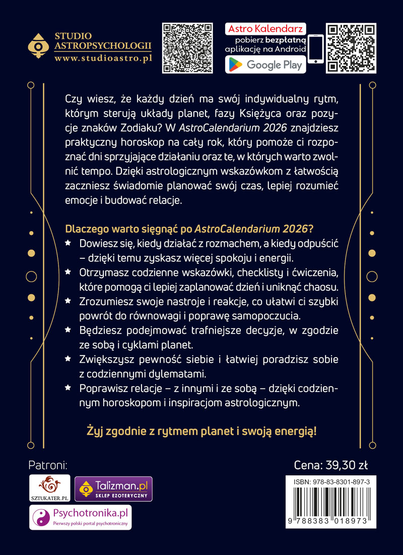 AstroCalendarium 2026 pozwoli ci uświadomić sobie, w jaki sposób astrologiczne aspekty oddziałują na twoje najbliższe relacje. Dowiesz się, dlaczego pewne dni są idealne na rozmowy emocjonalne, budowanie bliskości, negocjacje czy rozwiązywanie konfliktów. A inne lepiej poświęcić na indywidualne działania czy pracę duchową. Świadomość wpływu planet i faz Księżyca umożliwi ci większą uważność i zrozumienie w relacjach. Astrologia praktyczna, którą prezentuje Autor, oparta jest na wiedzy psychologicznej i duchowej. Dzięki temu zyskujesz głębszy wgląd w swoją osobowość, emocje i duchowe potrzeby. Z tym kalendarzem możesz skutecznie wykorzystywać fazy Księżyca, tranzyty oraz retrogradacje planet. Dzięki świadomie wspierając rozwój swoich relacji rodzinnych, zawodowych oraz partnerskich.