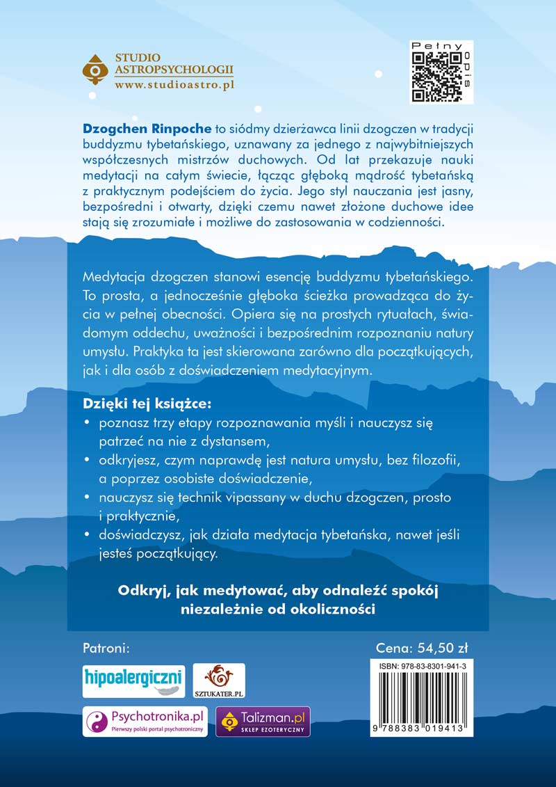 Dzogczen to jedna z najstarszych i najbardziej esencjonalnych praktyk buddyzmu tybetańskiego. Autor, Dzogchen Rinpoche to siódmy dzierżawca linii Dzogczen w tradycji buddyzmu tybetańskiego, uznawany za jednego z najwybitniejszych współczesnych mistrzów duchowych. Od lat przekazuje nauki medytacji na całym świecie, łącząc głęboką mądrość tybetańską z praktycznym podejściem do życia. Jego styl nauczania jest jasny, bezpośredni i otwarty, dzięki czemu nawet złożone duchowe idee stają się zrozumiałe i możliwe do zastosowania w codzienności.