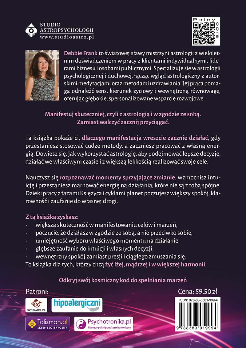 Czy zdarzyło ci się kiedyś wkładać ogromny wysiłek w wizualizację celu, tworzyć mapy marzeń i powtarzać afirmacje, a mimo to efekty były mizerne lub żadne? Być może czułeś wtedy frustrację, a nawet poczucie winy, sądząc, że robisz coś źle lub twoja wiara jest zbyt słaba. Prawda jest jednak zupełnie inna. Uniwersalne metody prawa przyciągania rzadko działają tak samo dla każdego, ponieważ każdy z nas posiada unikalną energetykę zapisaną w gwiazdach. Świadoma manifestacja z astrologią to proces, który pozwala dostroić twoje pragnienia do naturalnego rytmu, zamiast zmuszać cię do płynięcia pod prąd. Książka Debbie Frank to zaproszenie do świata, w którym przestajesz walczyć z życiem, a zaczynasz z nim tańczyć w zgodzie z kosmiczną melodią.