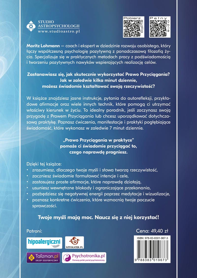 Autor książki, Moritz Lohmann proponuje proste 7-minutowe ćwiczenia, oparte na trzech filarach: klarownej intencji, pracy z obrazami i słowami (wizualizacje, afirmacje) oraz świadomego kierowania emocjami poprzez wdzięczność. To podejście łączy duchowe praktyki z codziennym życiem: prowadzi uwagę tam, gdzie chcesz zobaczyć efekt. Z czasem zamienisz „chcę” na „tworzę”, a manifestacja przestaje być przypadkiem i staje się codziennym nawykiem. Co więcej, znajdziesz wskazówki, jak tworzyć tablicę wizualizacji i jak łączyć medytację oraz uważność z działaniem tu i teraz. To szybka, przystępna ścieżka, dzięki której Prawo Przyciągania w praktyce wejdzie ci w krew.