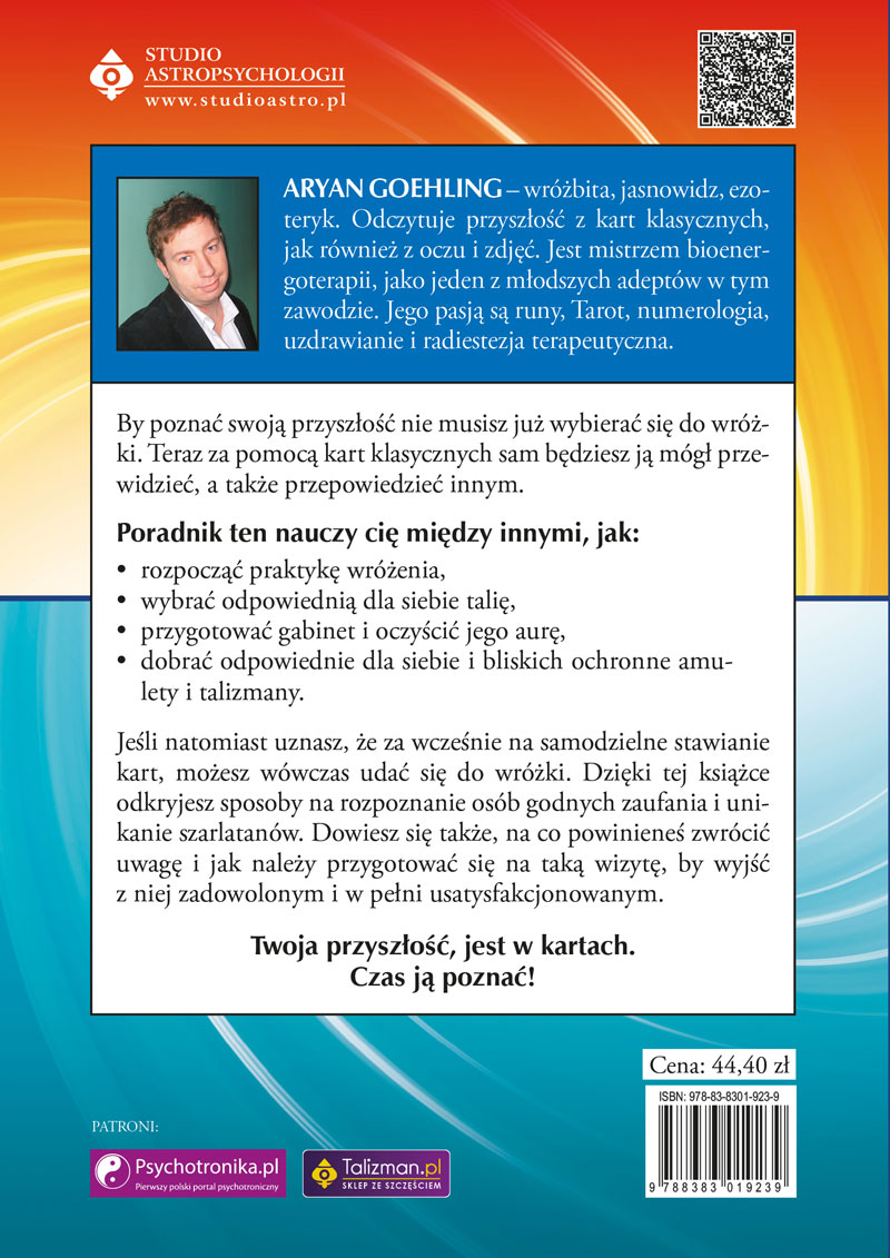 Ta książka to praktyczny poradnik cieszący się dużą popularnością wśród miłośników wróżenia i astropsychologii. Napisany przez wróżbitę, jasnowidza o wieloletnim doświadczeniu. Przepowiada on przyszłość z kart klasycznych, jak również z oczu i zdjęć. Jest mistrzem bioenergoterapii, jako jeden z młodszych adeptów w tym zawodzie. Jego pasją jest astropsychologia, rozwój duchowy, runy, Tarot, numerologia, uzdrawianie i radiestezja terapeutyczna. Dzięki Autorowi nauczysz się zawodu wróżbity oraz będziesz mógł samodzielnie i profesjonalnie wróżyć. Podpowie ci również od czego zacząć, na co zwrócić uwagę i jak rozwinąć w sobie intuicję oraz umiejętność jasnowidzenia. Uzyskasz wiele wskazówek na temat duchowości i rozkładów kart, a także ich interpretacji. Poznasz różnorodne układy m.in. na zdrowie i Andrzejki. Dowiesz się, jak urządzić gabinet i oczyścić jego aurę. Jaką wybrać odpowiednią talię oraz najskuteczniejsze talizmany i amulety ochronne nie tylko dla siebie, ale także i bliskich. Wskaże ci również potencjalne zagrożenia, które możesz napotkać w tym fachu. Nauczy cię przekazywać klientowi trudną prawdę, tak by go nie urazić. A także podpowie co wolno mówić, a czego nie.